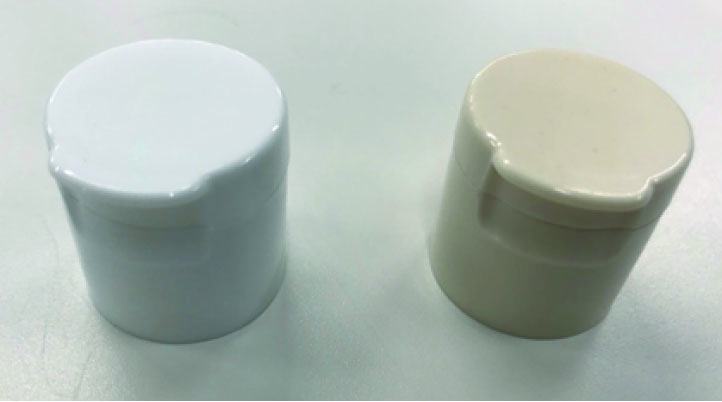 左边PP(100%)。 右边 PP(25:约80%) 大米树脂(5:约16%)的百分比混合而成。(米率(生物质率):约11% )